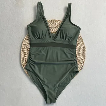 Women Swimwear High Waist One Piece Swimsuit Deep V Neck Mesh Sheer Tummy Control Bathing Suit