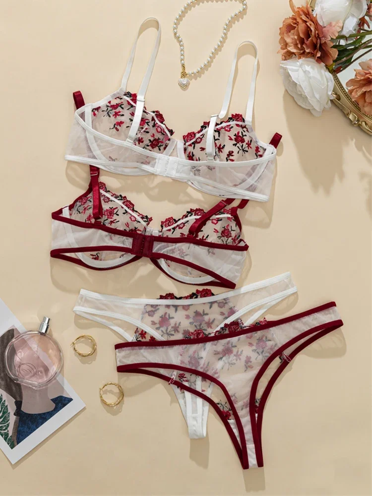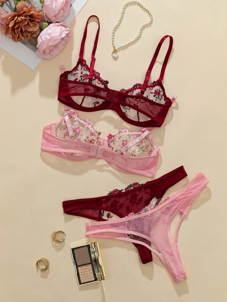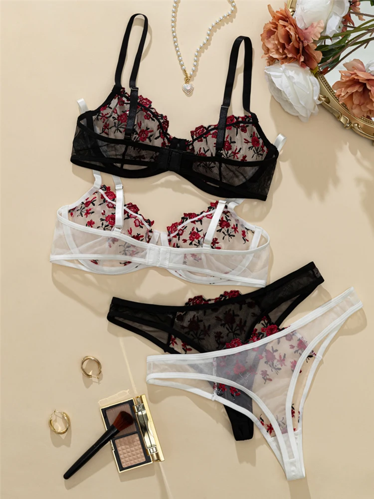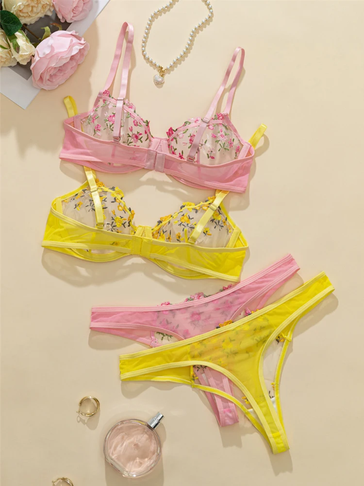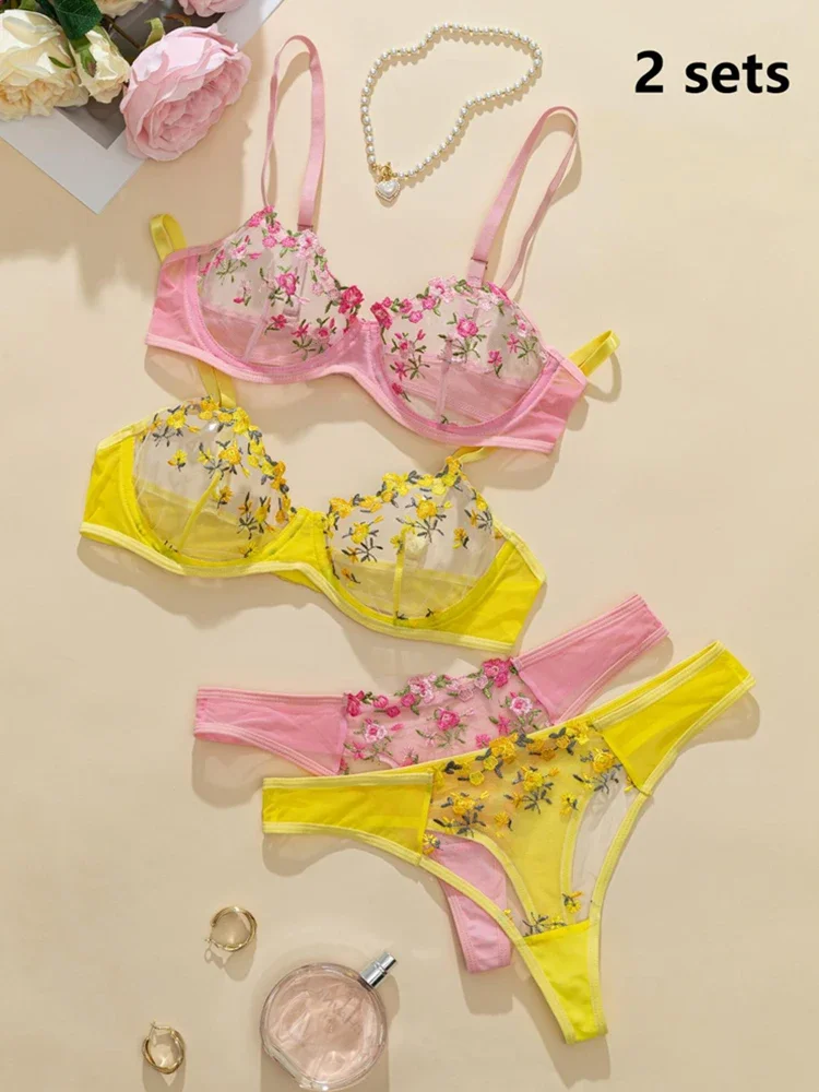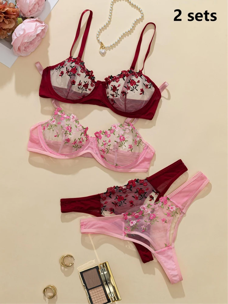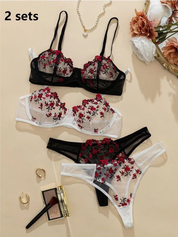 2 Sets Romantic Lingerie Floral Embroidery Women Underwear Transparent Bra Sets Ensemble Sexy Outfit Fantasty Underwear Intimate