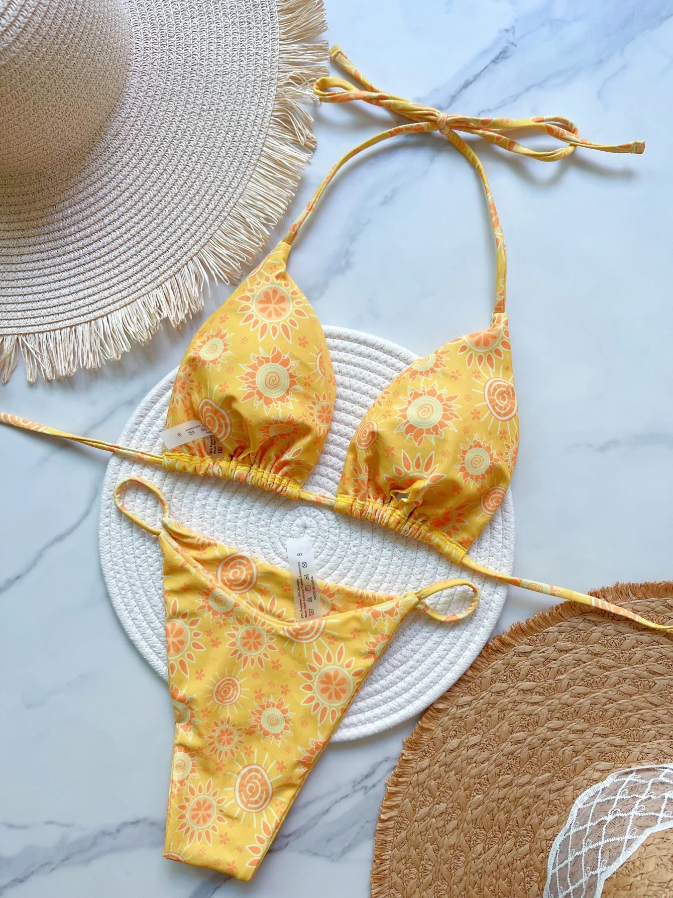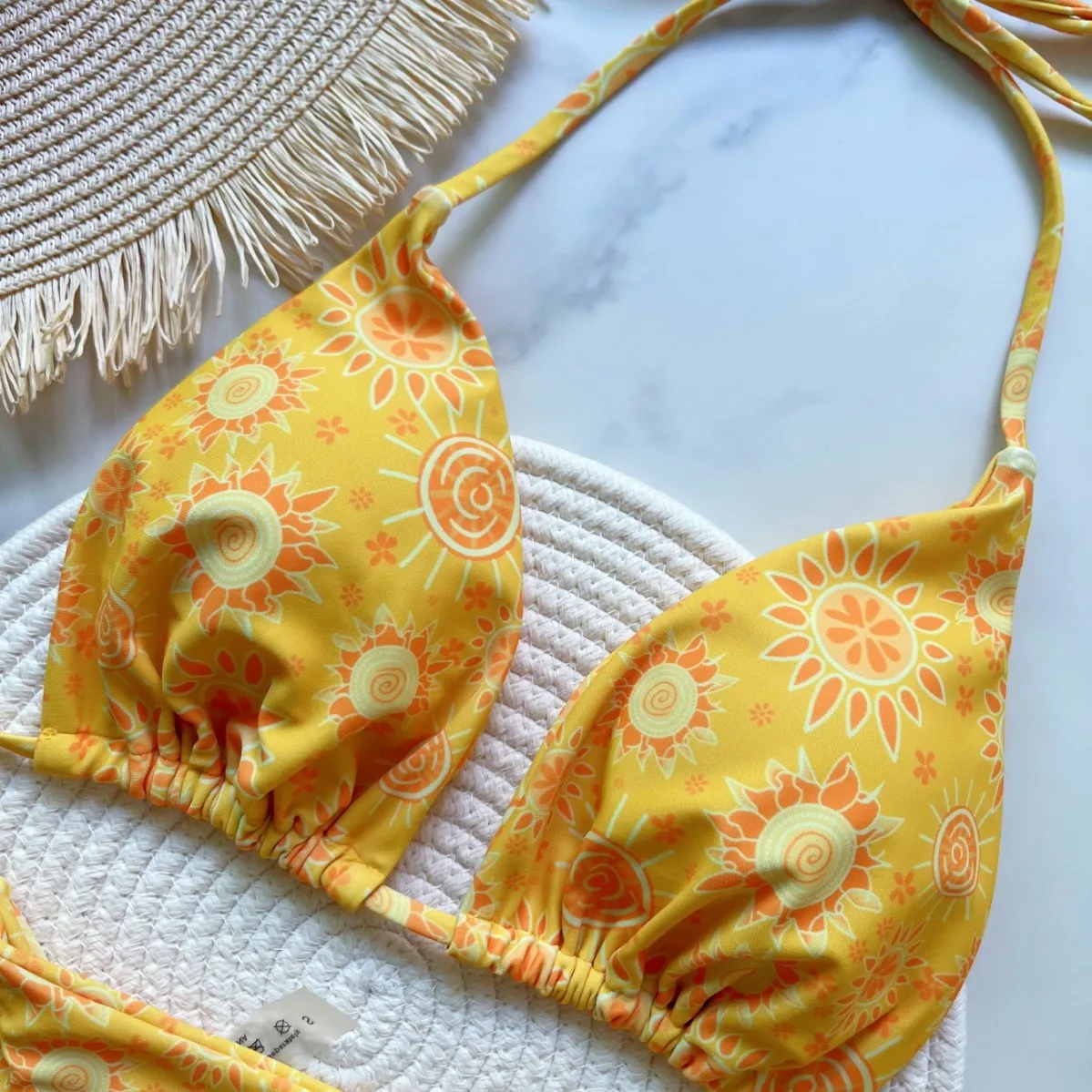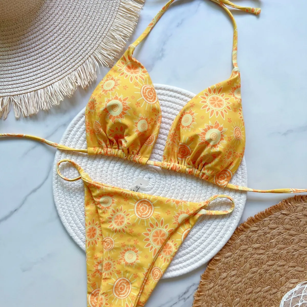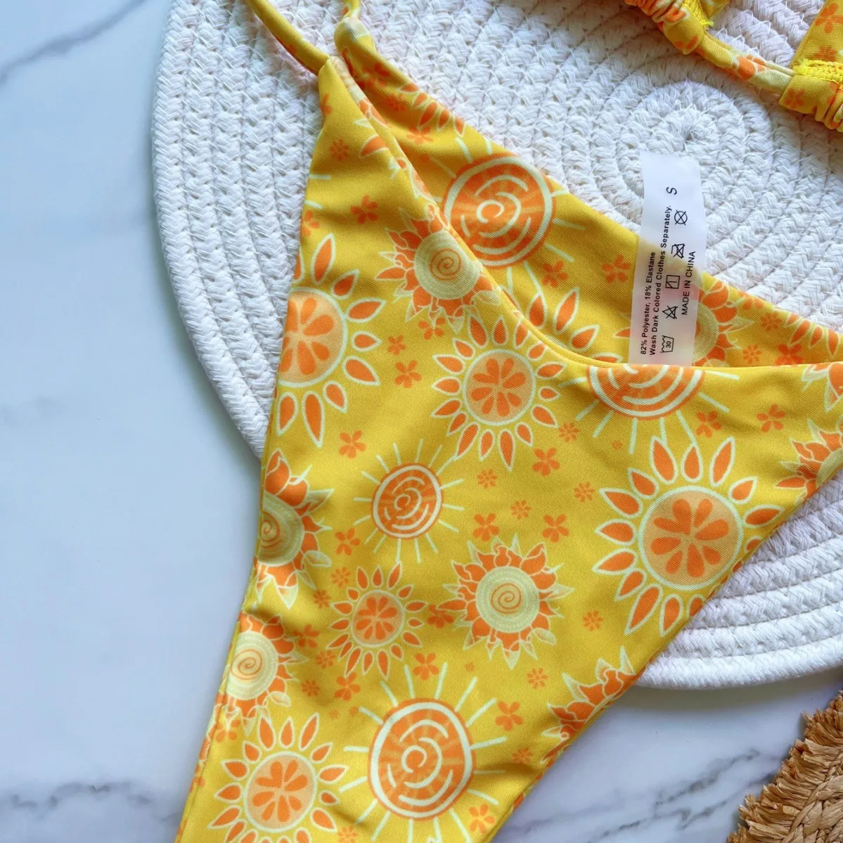 2025 new yellow print women’s strap bikini suit low waist lace-up beach beach swimsuit