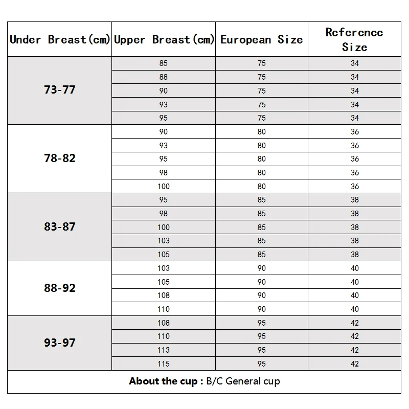 Size: 34 (75), 36 (80), 38 (85), 40 (90), 42 (95)