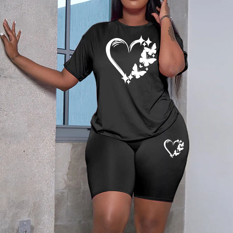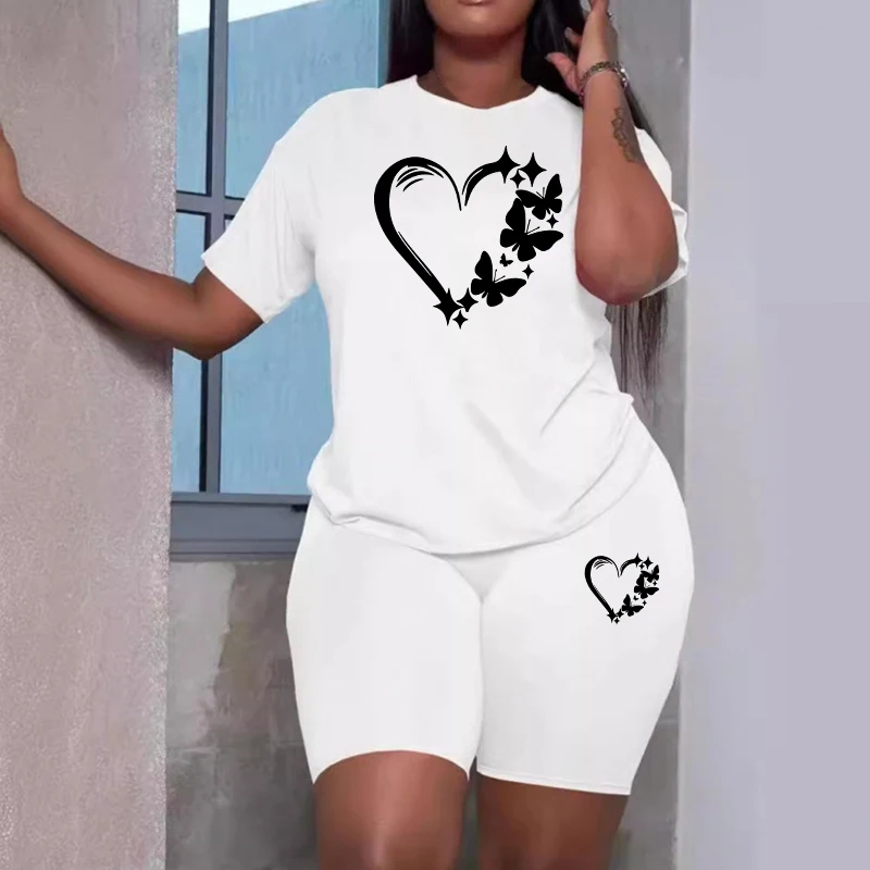 Heart Butterfly Printed Outfit for Women Summer Daily Casual Sports T-shirt and Shorts Ladies Home Outdoor Comfortable Tracksuit