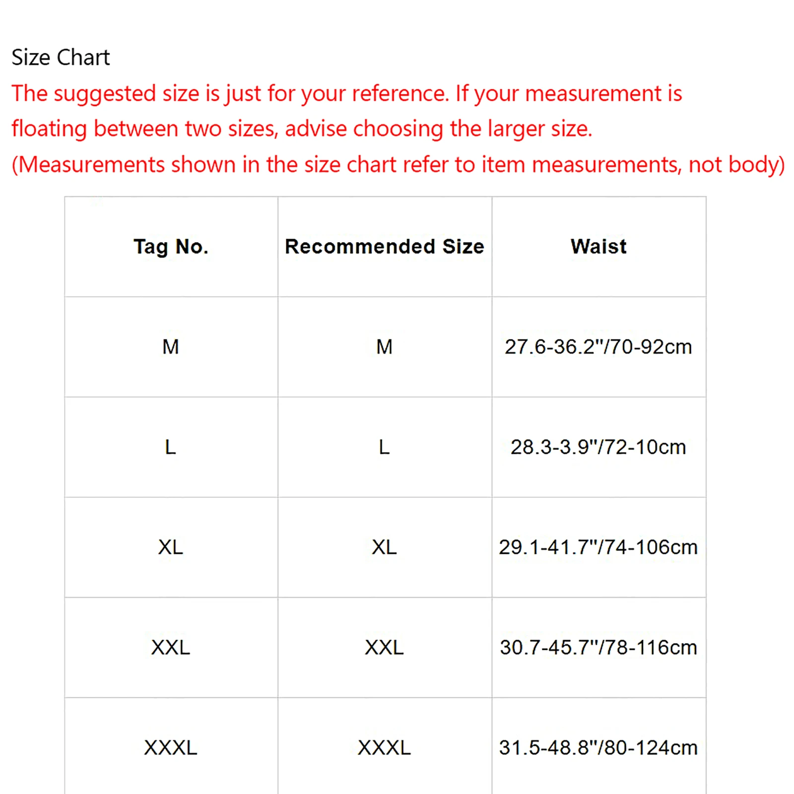 Size ChartThe suggested size is just for your reference. If your measurement is floating between two sizes, advise choosing the larger size. (Measurements shown in the size chart refer to item measurements, not body)