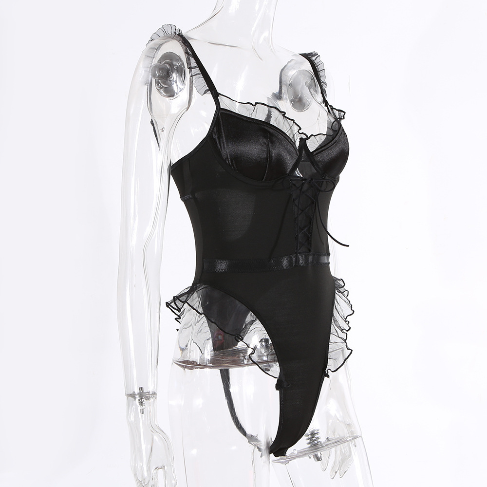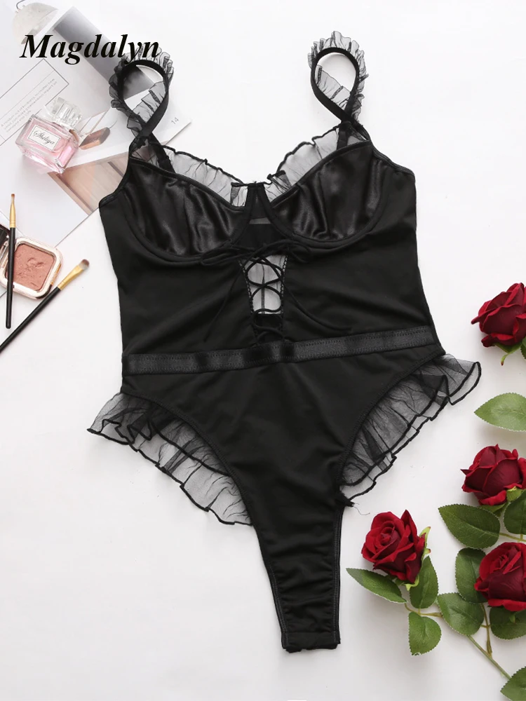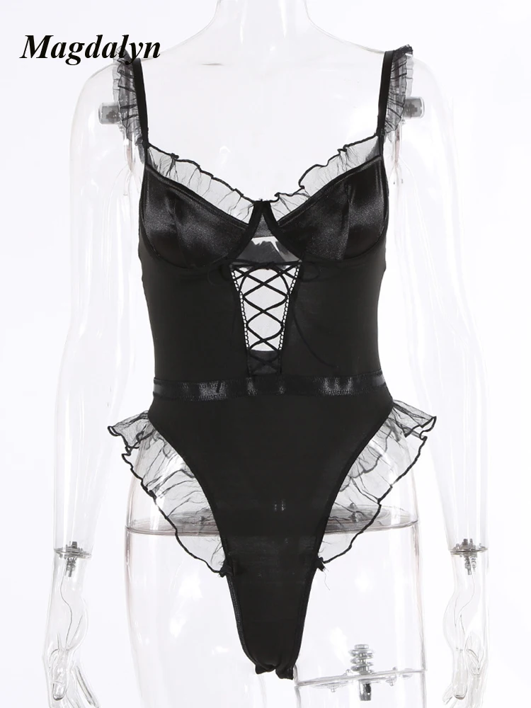 Magdalyn Women Ruffle Lace Strappy Bodysuits Fashion Intimate Skinny Catsuit Lingerie Chic Slim Sexy Bodycon Combination Rompers