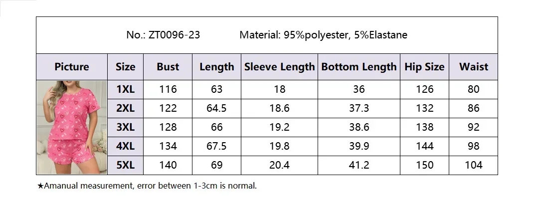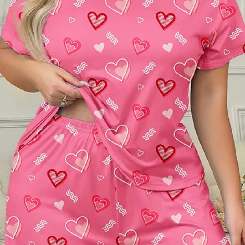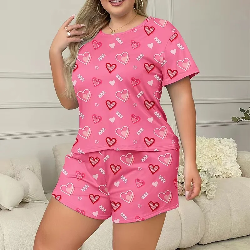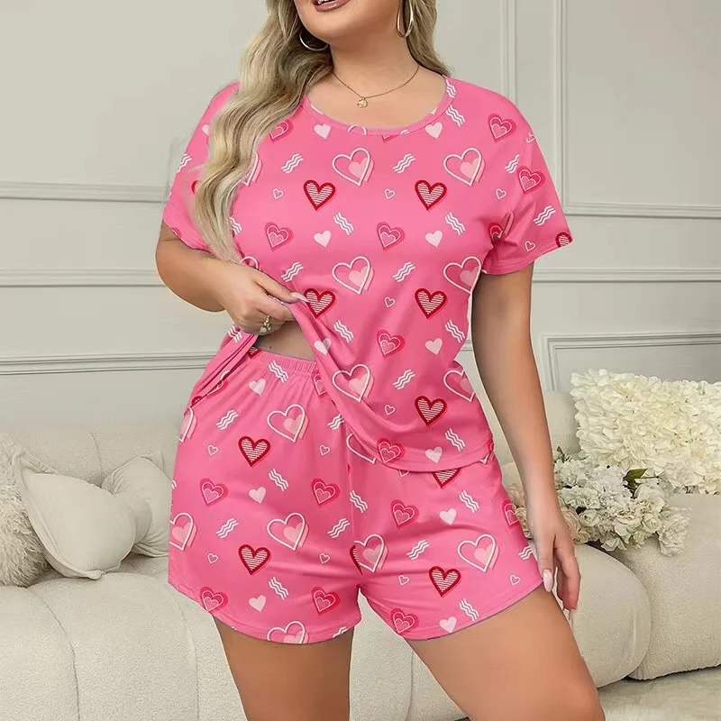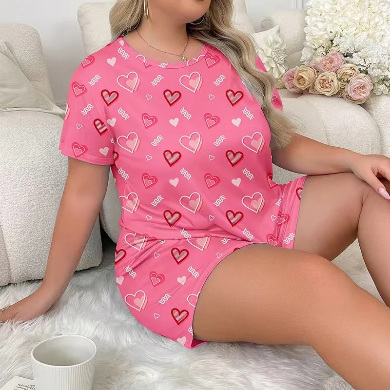 Pink Heart Print Plus-Size Women Sleepwear Pajama Set Nightgowns Short Sleeve Tee and Shorts Nightclothes 3XL 4XL 5XL Smooth