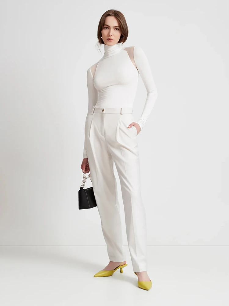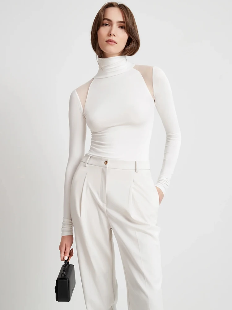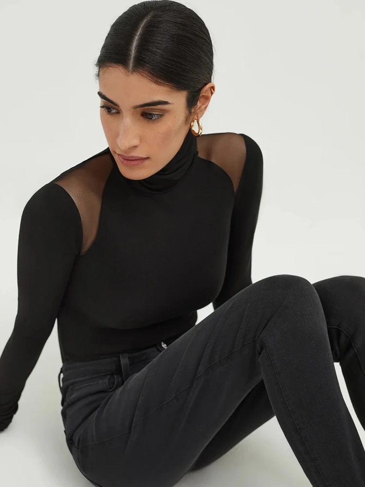 Sexy Mesh Patchwork Bodysuits Women Sheath Fashion Tees Tops Long Sleeves Turtleneck Bodycon Streetwear Rompers Female T-Shirt