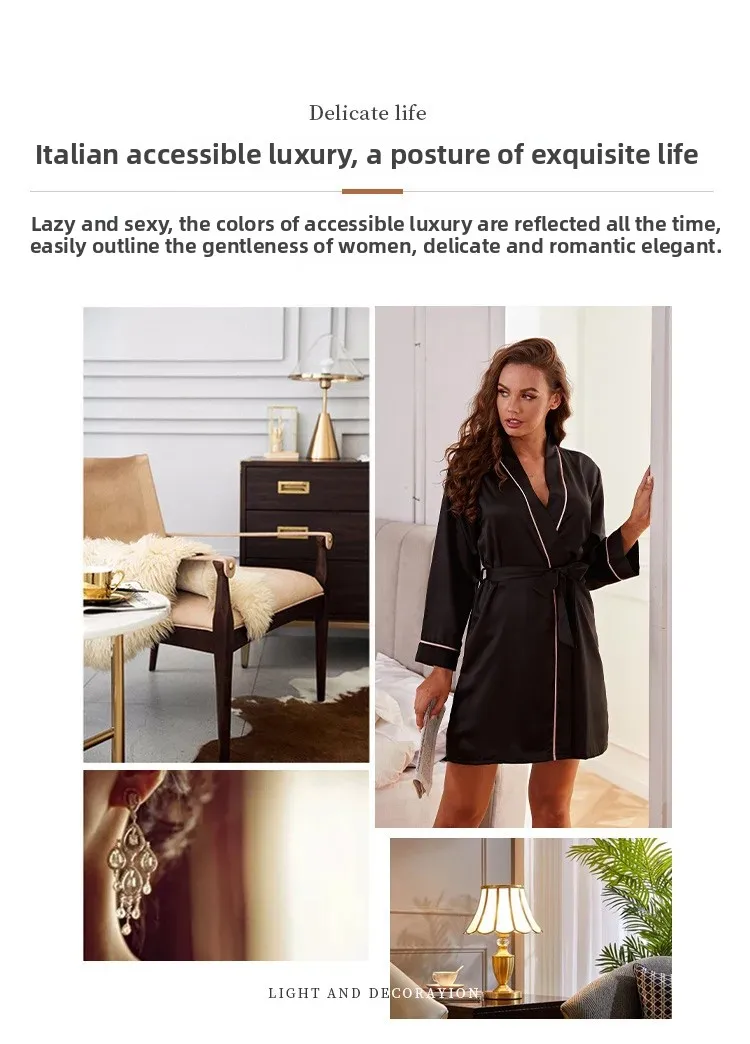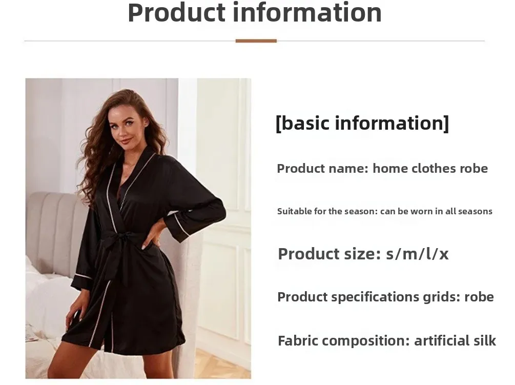 Women’s Collared Mid-Length Sleepwear Silk Simulation Sexy Home Clothes Pure Black Belted Robe Nightgown Summer Home Comfort