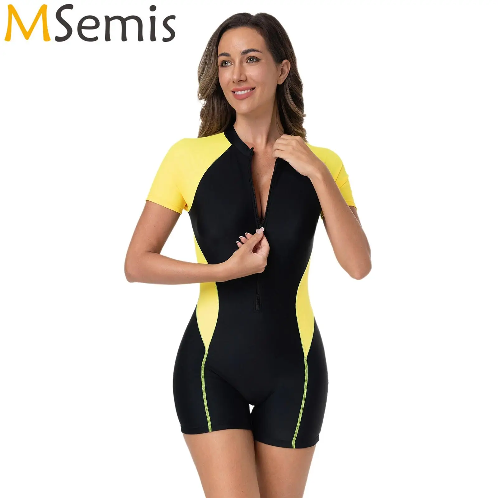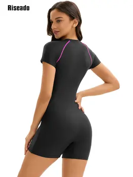 Womens One Piece Sport Swimsuit Short Sleeves Chest Pads Boyleg Zipper Swimwear Modest Rash Guard Bodysuit Swimming Bathing Suit
